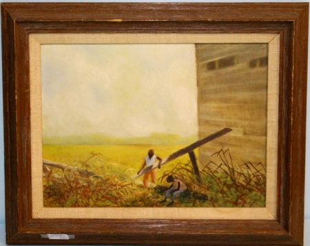 Harry Maddox (Mississippi) signed oil on board of African Americans in field.; 15" w., 12 1/2" h. Harry Maddox (Mississippi) signed oil on board of African Americans in field.; 15" w., 12 1/2" h.