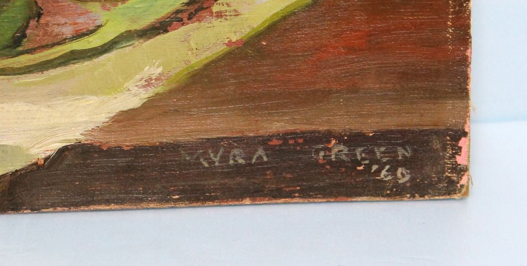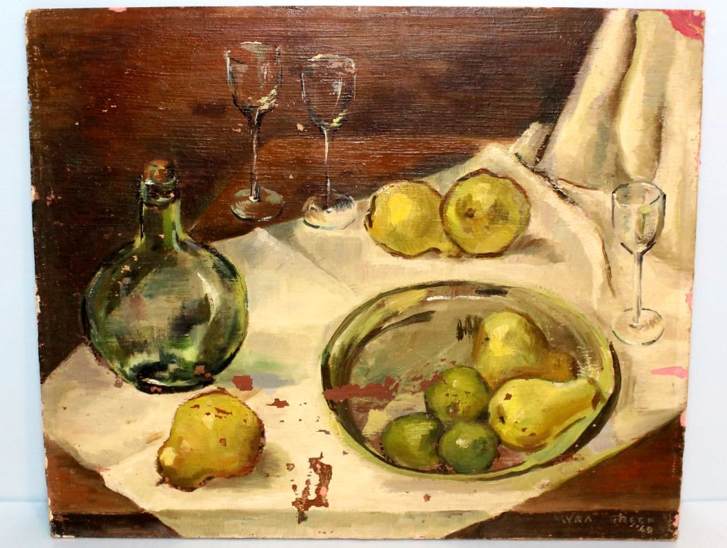 Oil on board still life by Myra Green, Mississippi artist, unframed.; 17" w., 14" h. Oil on board still life by Myra Green, Mississippi artist, unframed.; 17" w., 14" h.
