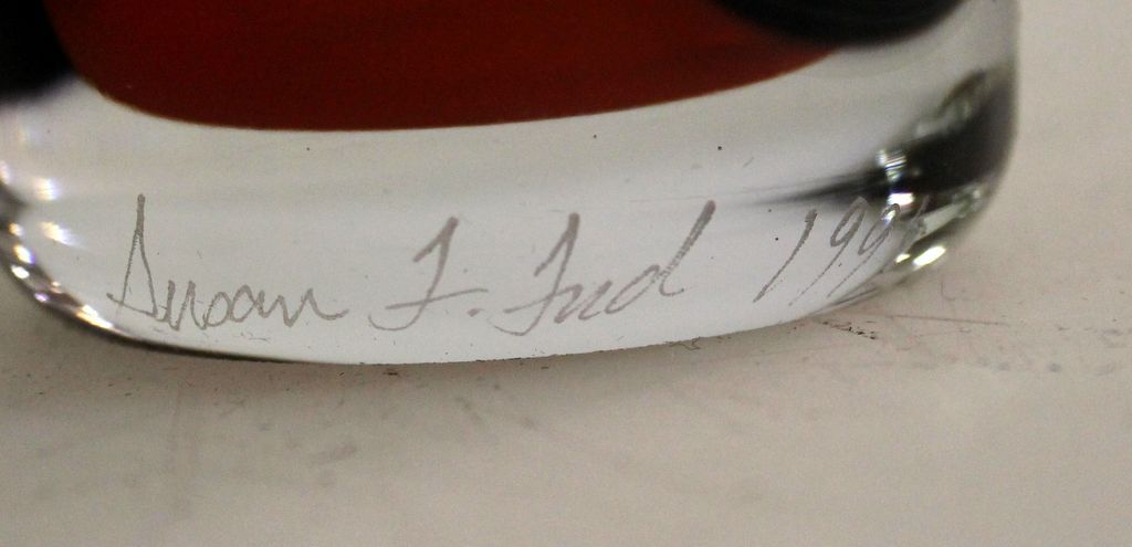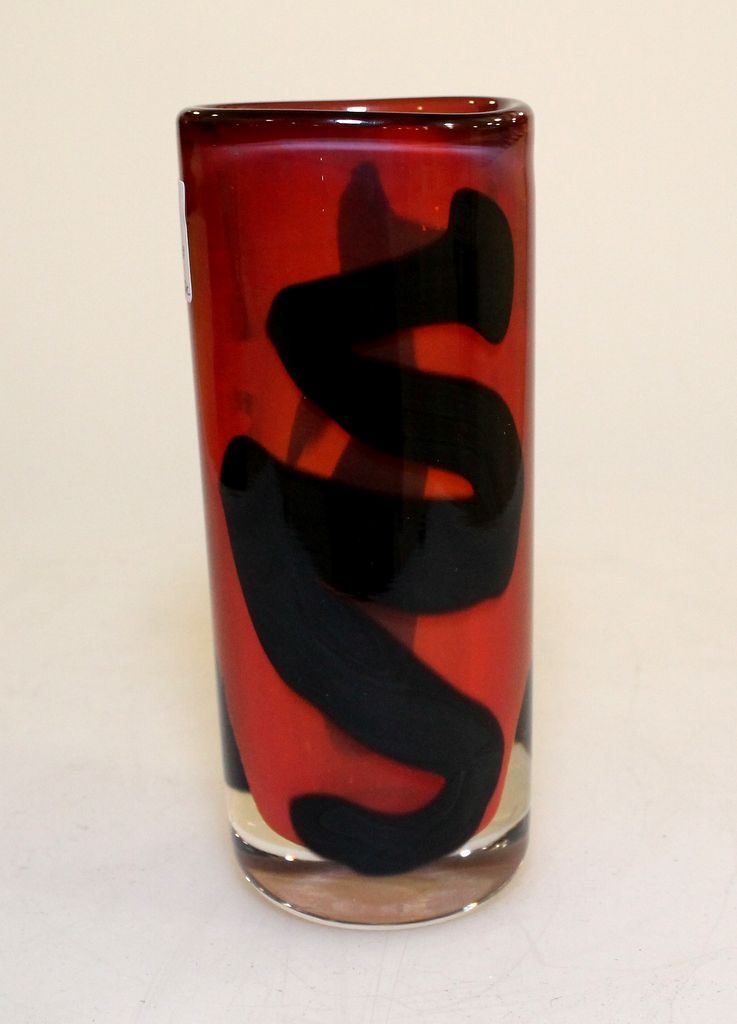 Red and black Susan F. Ford 1998 art glass vase.; 3" dia., 7" h. Red and black Susan F. Ford 1998 art glass vase.; 3" dia., 7" h.