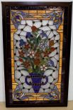 Stained and clear glass window with blue flower urn design in wood frame.; 22" w., 36" h. Stained and clear glass window with blue flower urn design in wood frame.; 22" w., 36" h.
