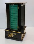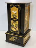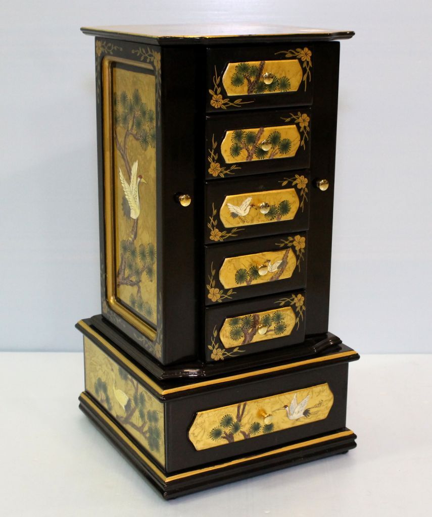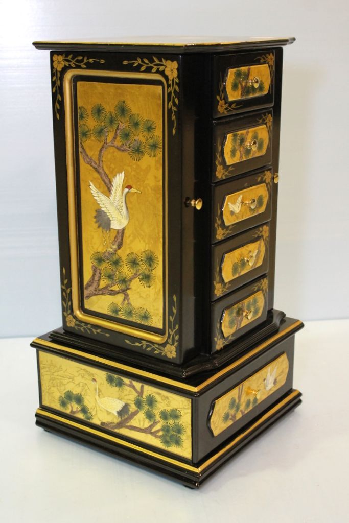 Elaborate oriental design black lacquer jewelry box with painted cranes.; 9" w., 9" d., 19" h. Elaborate oriental design black lacquer jewelry box with painted cranes.; 9" w., 9" d., 19" h.