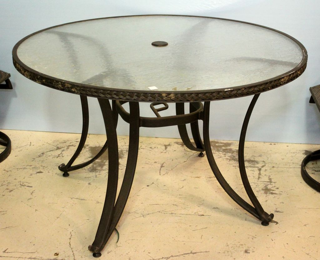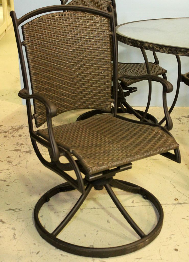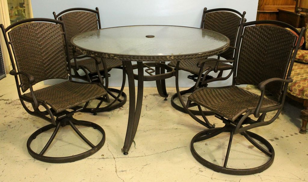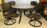 Round patio table and four rocking swivel chairs. Round patio table and four rocking swivel chairs.