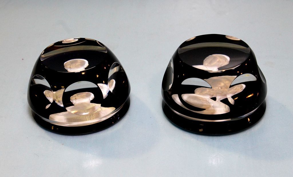 Two baccarat paperweights with classical portraits, ruby base.; 4" dia. Two baccarat paperweights with classical portraits, ruby base.; 4" dia.