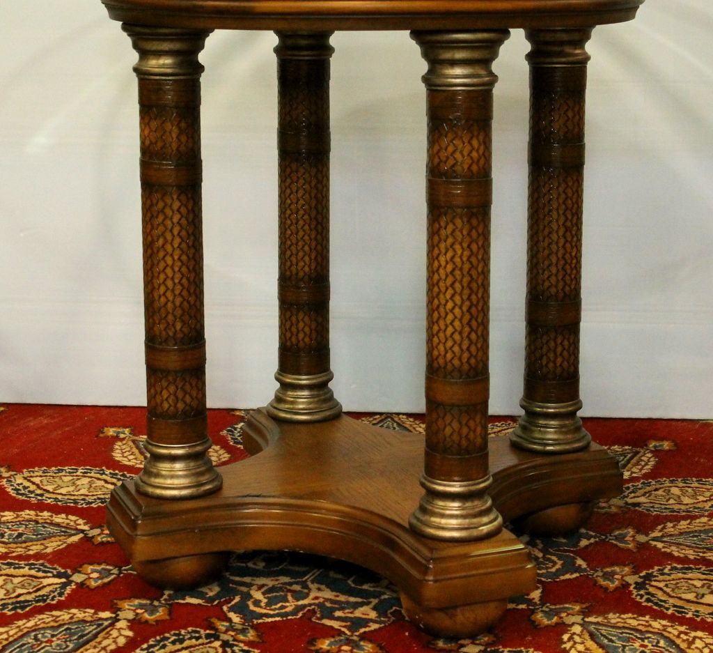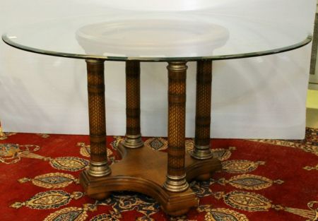 Round glass top table with four pedestal base.; 50" dia., 30" h. Round glass top table with four pedestal base.; 50" dia., 30" h.