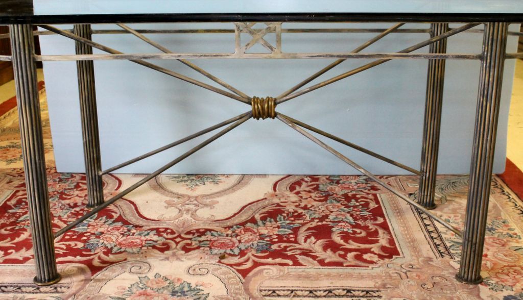 Glass top dining table with oval metal base, glass has chip on bottom.; 42" w., 84" l., 30" h. Glass top dining table with oval metal base, glass has chip on bottom.; 42" w., 84" l., 30" h.