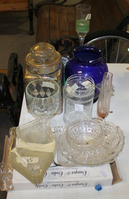 900 Miscellaneous Lot of Glass Items Including small 3" vase, metal plate holder, jar, cobalt vase, and bowl.