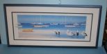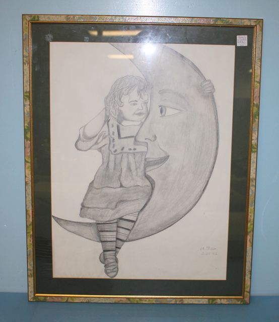904 New York Grafic Society Print, Charcoal Drawing of Girl Sitting on Half Moon, and Print "Lets have a Paddle" by Bernie Walsh New York Grafic Society Print 35"w., 31"h., Charcoal Drawing of Girl Sitting on Half Moon, signed M. Skipper 3-25-92, 23