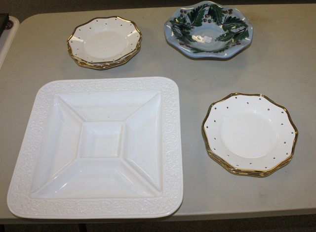 Six Gold Dotted China Plates, Divided Ceramic Serving Dish, Gail Pittman Bowl Six Gold Dotted China Plates 8"dia., Divided Ceramic Serving Dish, 10" Gail Pittman Bowl. Six Gold Dotted China Plates, Divided Ceramic Serving Dish, Gail Pittman Bowl Six Gold Dotted China Plates 8"dia., Divided Ceramic Serving Dish, 10" Gail Pittman Bowl.
