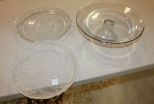 1001 Two Glass Sandwich Trays and Glass Cake Stand Two Glass Sandwich Trays 12"dia., and Glass Cake Stand (chip on rim) 13"dia.