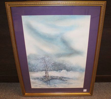 1006 Watercolor of Snow Scene in the Countryside Signed Esmer Thomas 23"w., 30"h.