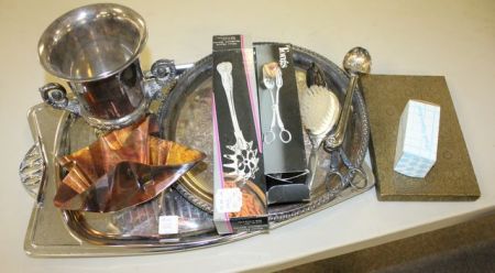 Lot of Silverplate Trays, Snuffer, Tongs, Trophy, and Brush Lot of Silverplate Trays, Snuffer, Tongs, Trophy, and Brush. Lot of Silverplate Trays, Snuffer, Tongs, Trophy, and Brush Lot of Silverplate Trays, Snuffer, Tongs, Trophy, and Brush.