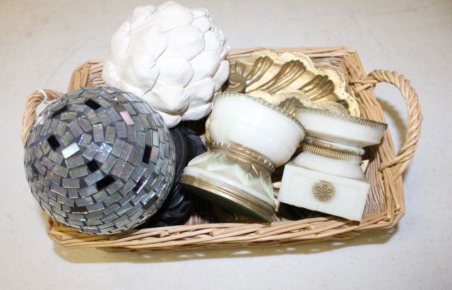 Basket of Miscellaneous Items Plastic ball, candlesticks, Shell ends to drapery rods, vase stand. Basket of Miscellaneous Items Plastic ball, candlesticks, Shell ends to drapery rods, vase stand.