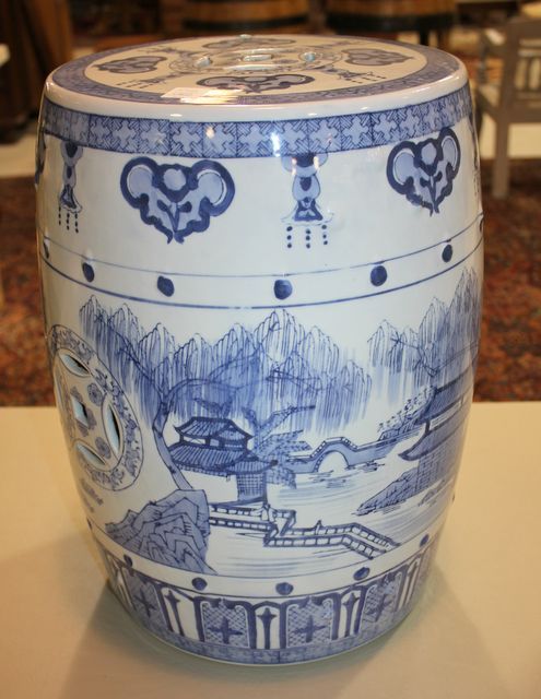 1042 Blue and White Porcelain Garden Stool 12"dia., 18"h.