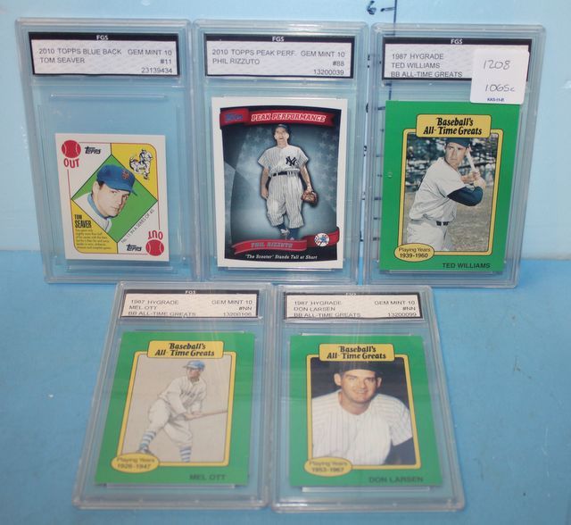1208 4 Old Baseball Cards 1987 ted williams, 2010 phil rizzuto, 2010 tom seaver, 1987 male ott, 1987 don larsen