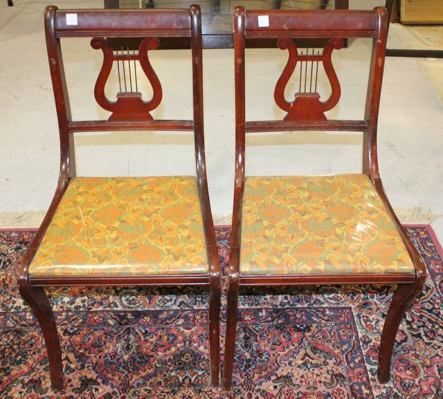 2 Mahogany Lyre Back Chairs 33"h. 2 Mahogany Lyre Back Chairs 33"h.