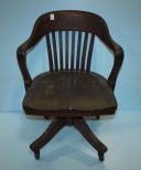 In original condition, oak swivel desk chair; 23" w., 21" dia., 33 1/2" h. In original condition, oak swivel desk chair; 23" w., 21" dia., 33 1/2" h.