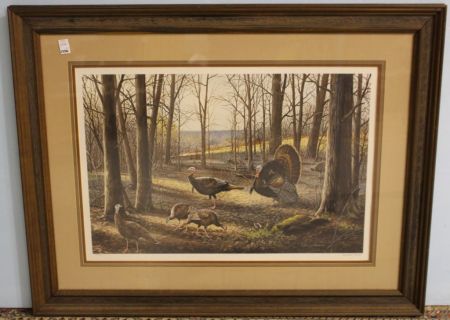 Large 1981 limited edition 508/950 turkey print signed Maynard Rose; Artist info on back; 44" w., 34" h. Large 1981 limited edition 508/950 turkey print signed Maynard Rose; Artist info on back; 44" w., 34" h.