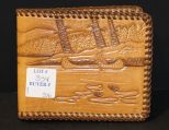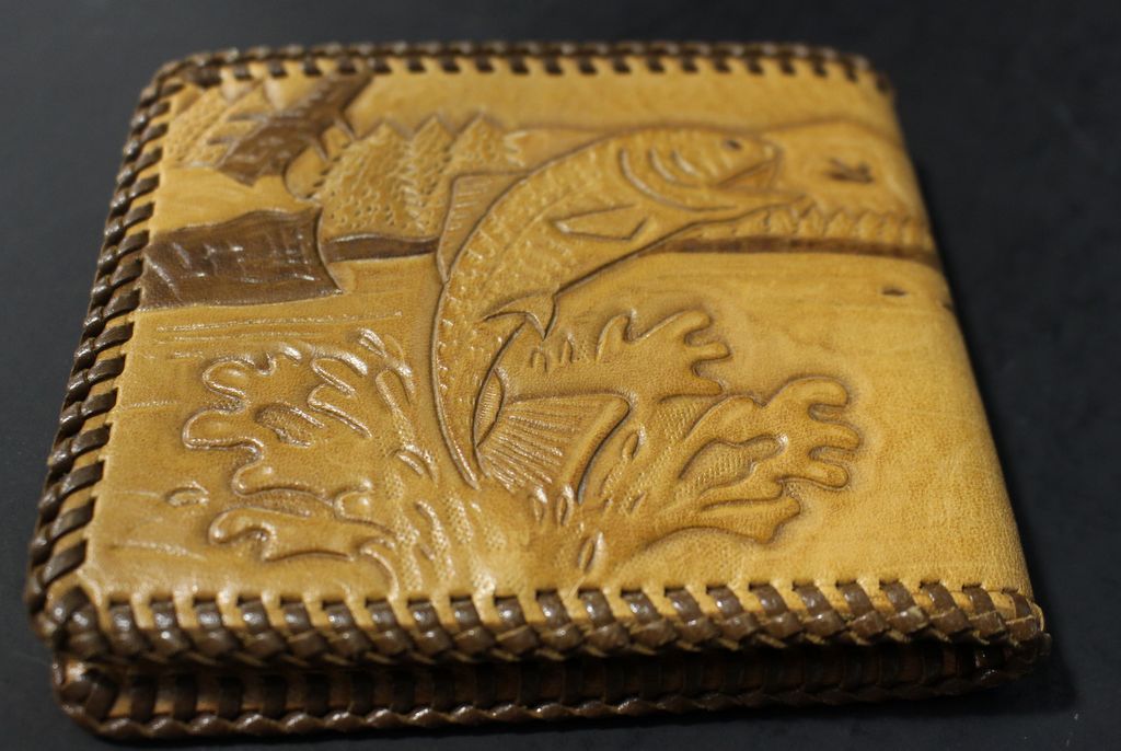 Vintage hand tooled leather wallet with Indian and fish scene Vintage hand tooled leather wallet with Indian and fish scene