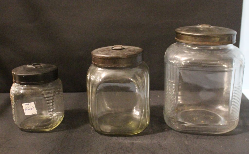 Three early glass canisters for candy, flour, ets. ; 5", 6 1/2", 8" Three early glass canisters for candy, flour, ets. ; 5", 6 1/2", 8"