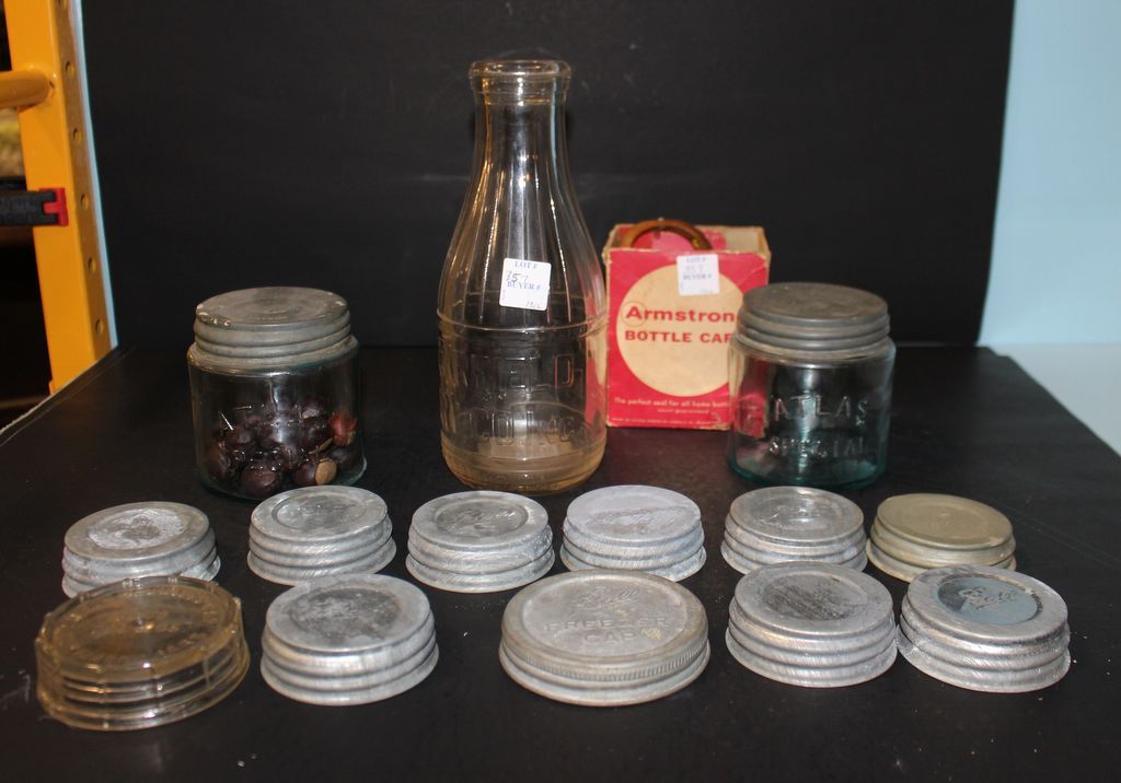 357 Group of Zinc Lids, Two Jars, Clearfield Dairy Company Milk Bottle, Box of Bottle Caps