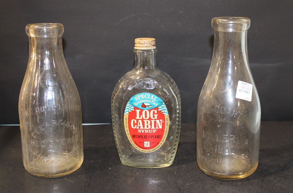 403 Log Cabin Syrup Bottle, One Quart Miller Dairy Company Bottle, One Quart Clearfield Milk Bottle