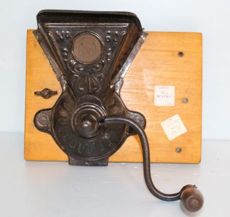 Charles Parker Company wall mounted grinder; 9" w., 6 1/2" h. Charles Parker Company wall mounted grinder; 9" w., 6 1/2" h.