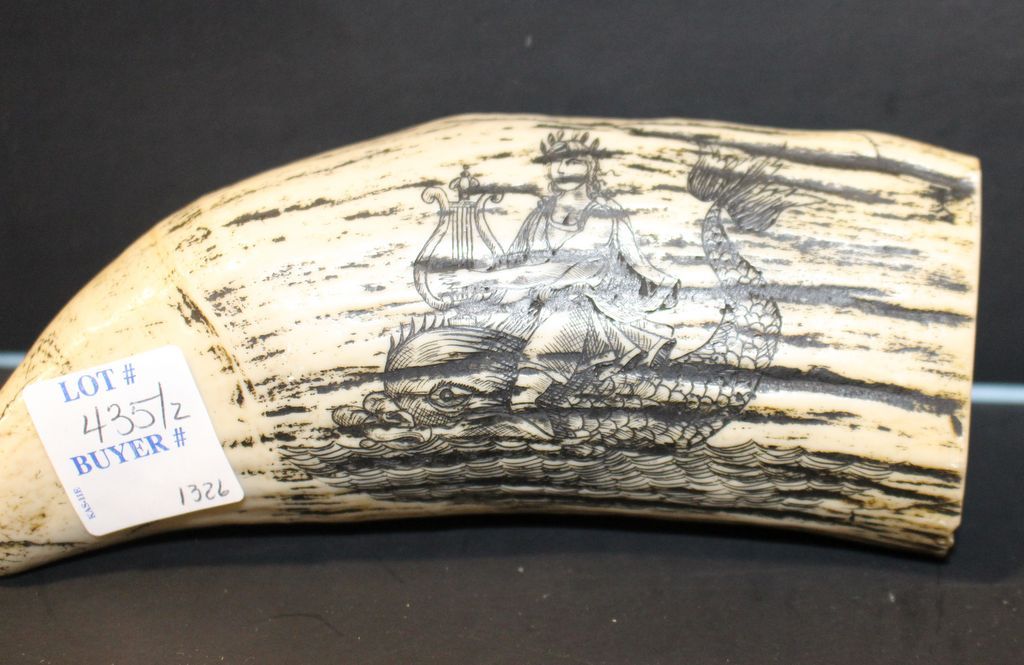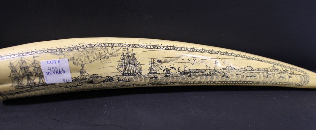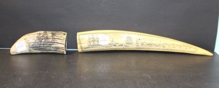 Bone tooth carving 5 1/2" w. ; carving of ships 14 1/2" w. Bone tooth carving 5 1/2" w. ; carving of ships 14 1/2" w.
