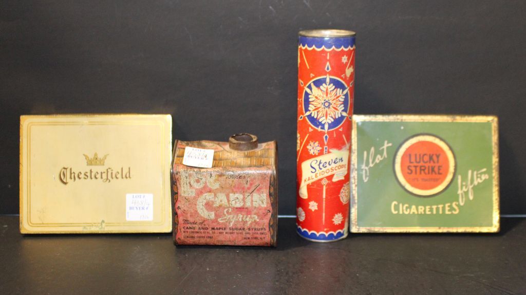 438 Vintage Tin Log Cabin Syrup Can, Lucky Strike Tin, Chesterfield Tin, Kaleidoscope