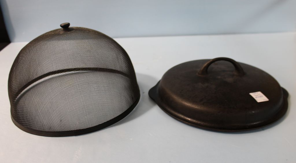 Mesh food cover 10 1/2" dia. ; iron skillet lid #8, 11 1/2" dia. Mesh food cover 10 1/2" dia. ; iron skillet lid #8, 11 1/2" dia.