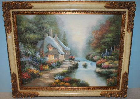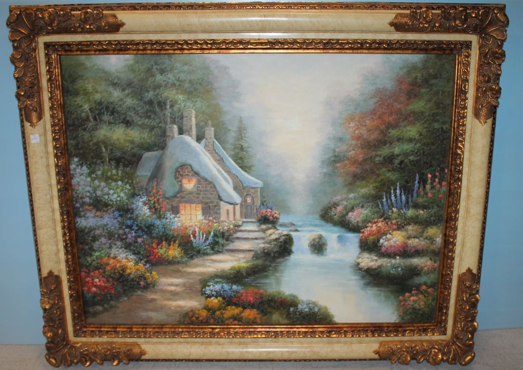 Oil painting of cottage in the Thomas Kinkaid style; 60" w., 46" h. Oil painting of cottage in the Thomas Kinkaid style; 60" w., 46" h.