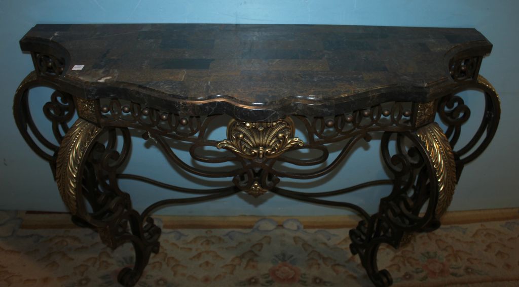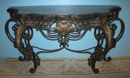 Cabriole leg iron console with marble top; 55" w., 18 1/2" dia., 34" h. Cabriole leg iron console with marble top; 55" w., 18 1/2" dia., 34" h.