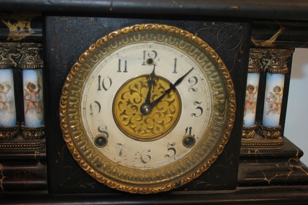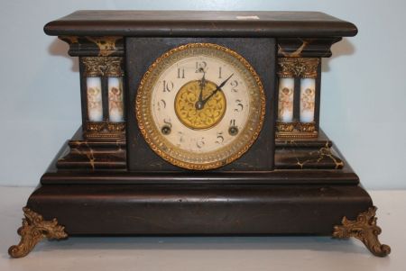 Mantel clock with painted columns, brass paw feet; 18" w., 7 1/2" dia., 11" h. Mantel clock with painted columns, brass paw feet; 18" w., 7 1/2" dia., 11" h.