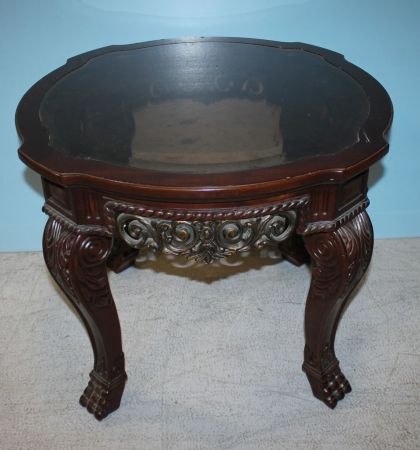 Contemporary beveled glass side table with carved feet; 28 1/2" dia., 24" h. Contemporary beveled glass side table with carved feet; 28 1/2" dia., 24" h.