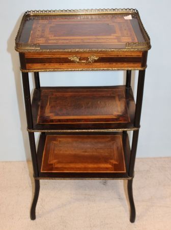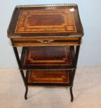 Three tier inlay table with brass gallery and banding, 15 1/2" w., 11 1/2" dia., 32" h. Three tier inlay table with brass gallery and banding, 15 1/2" w., 11 1/2" dia., 32" h.