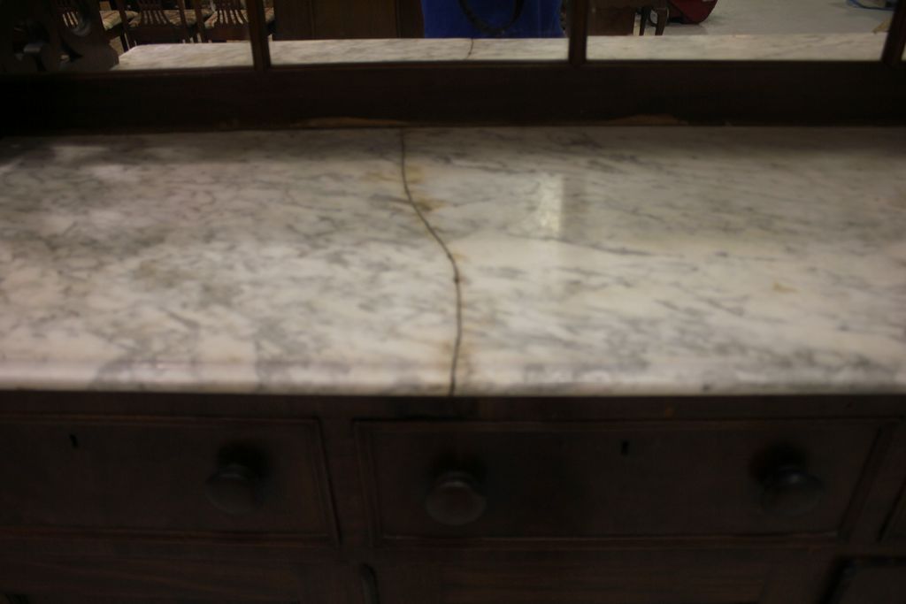 Has eterge mirrored top, marble is broken; 59" w., 76" h., 19" d. Has eterge mirrored top, marble is broken; 59" w., 76" h., 19" d.