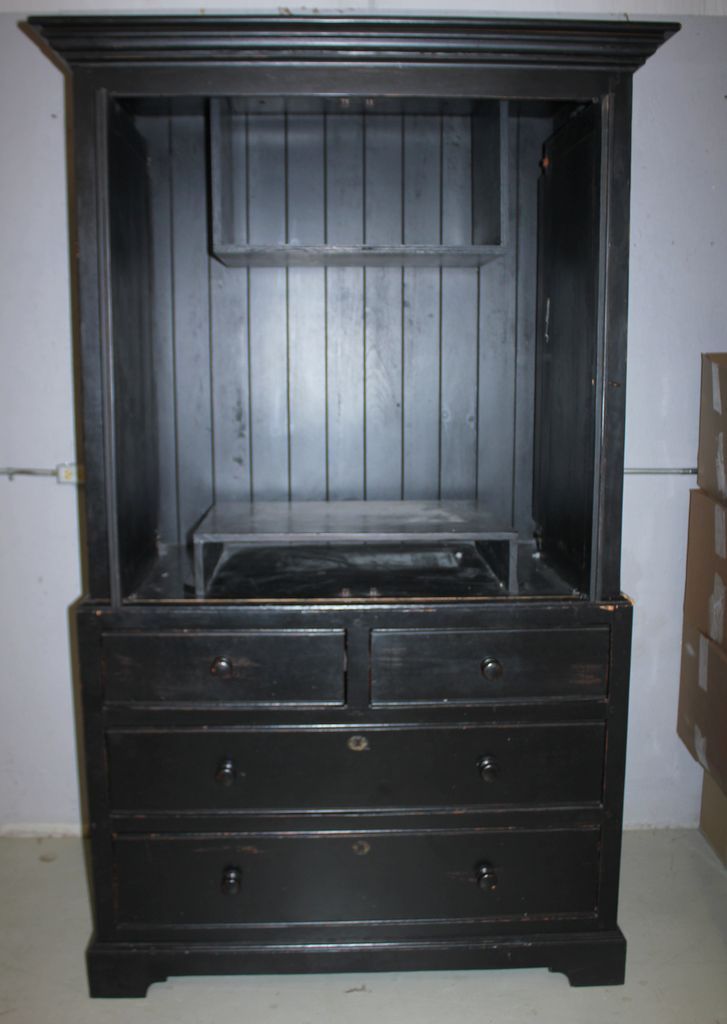 Painted black, two door, four drawer entertainment center; 36" w., 28" d., 85" h. Painted black, two door, four drawer entertainment center; 36" w., 28" d., 85" h.