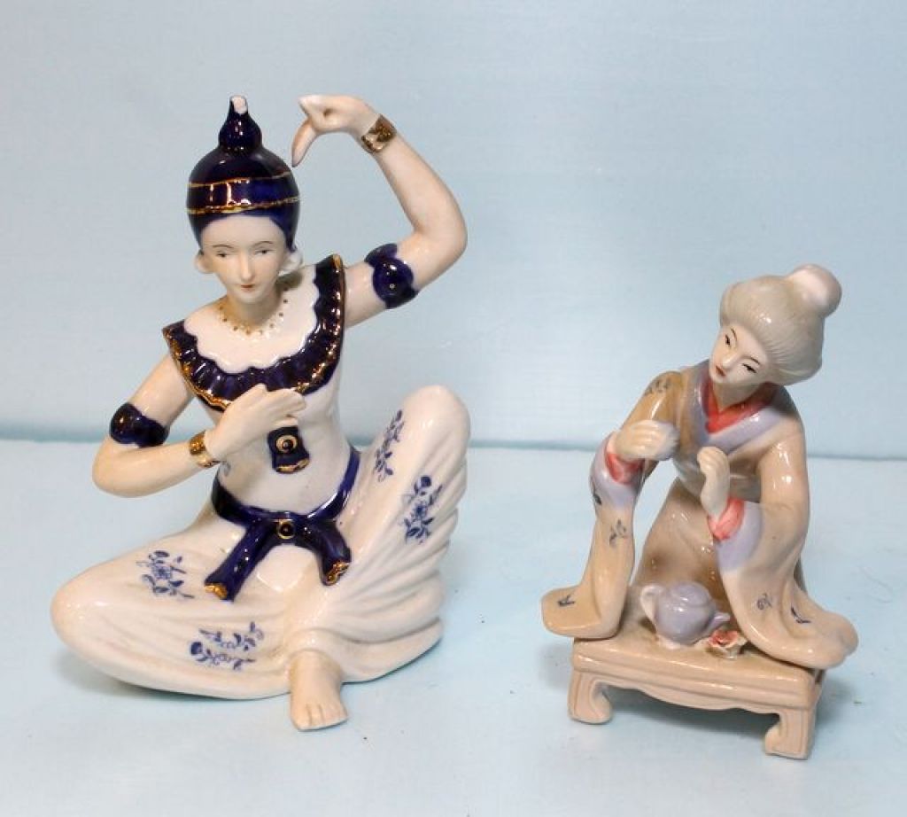 Porcelain figurine of lady with teapot 5 1/2" h.; Porcelain figurine of seated lady (chip) 8" h. Porcelain figurine of lady with teapot 5 1/2" h.; Porcelain figurine of seated lady (chip) 8" h.