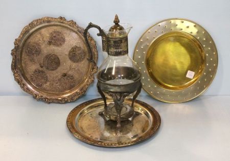 808 Three Silverplate Trays & Silverplate and Glass Water Pot