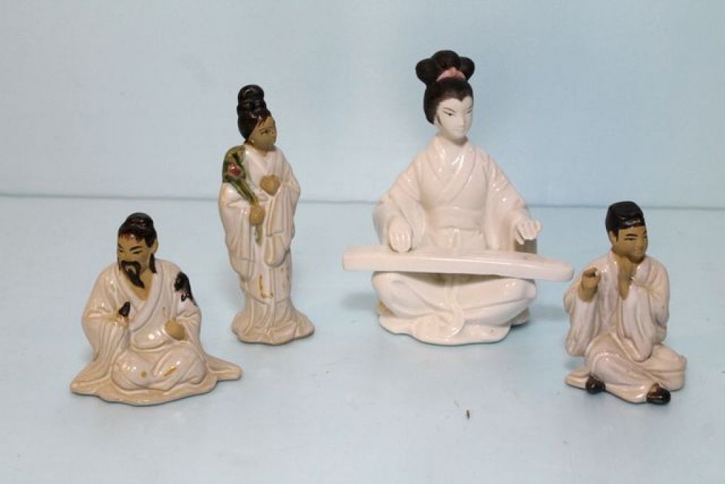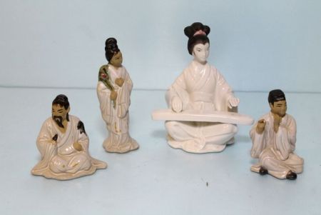 890 Three Small Mud Figurines & Porcelain Maiden