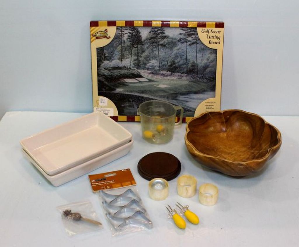 Golf scene cutting board, wood bowl, mixing cup, napkin rings & casserole dishes Golf scene cutting board, wood bowl, mixing cup, napkin rings & casserole dishes