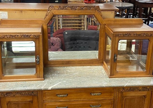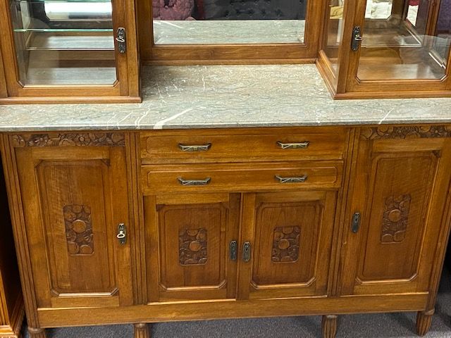 Vintage French Provincial Marble Top Sideboard, mirror with side glass cabinets, some feet are weak, good condition. 67"h., 62"w., 20"d. Location: 2nd Row Vintage French Provincial Marble Top Sideboard, mirror with side glass cabinets, some feet are weak, good condition. 67"h., 62"w., 20"d. Location: 2nd Row