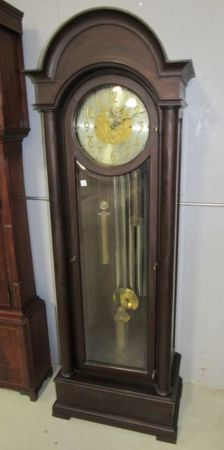 Waltham Grandfather Dome Top Clock, Glass doors, glass sides, weights, key, pendulum, has some scratches on finish, 76"h., 26"w. Location: 4th Row Waltham Grandfather Dome Top Clock, Glass doors, glass sides, weights, key, pendulum, has some scratches on finish, 76"h., 26"w. Location: 4th Row