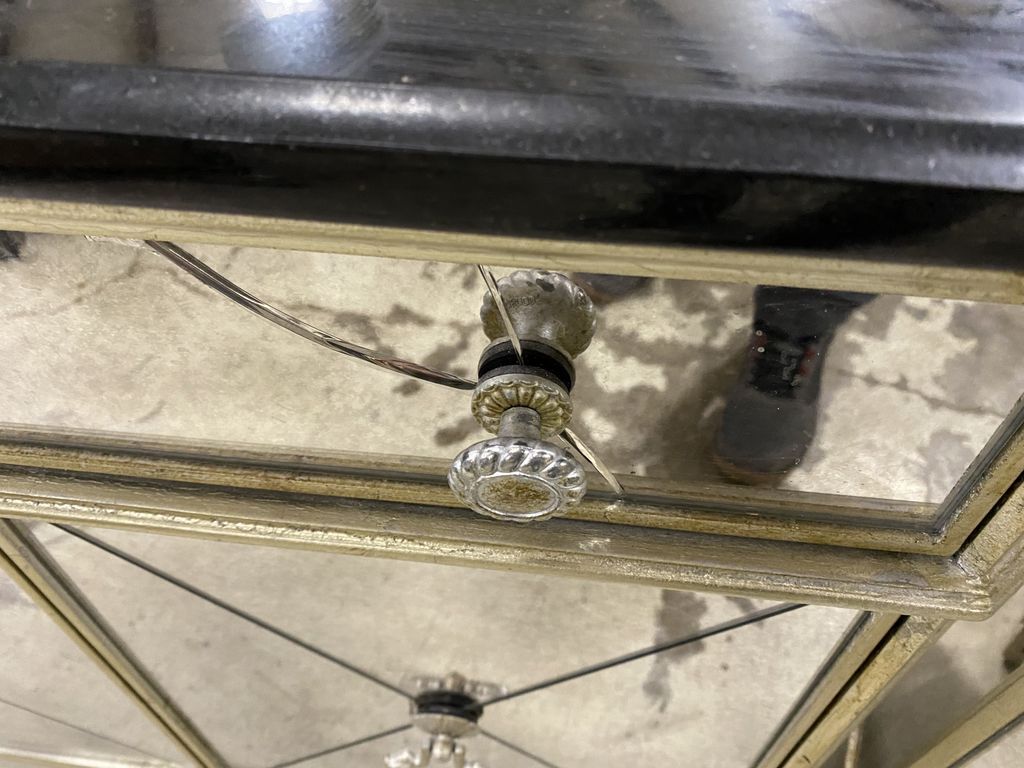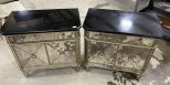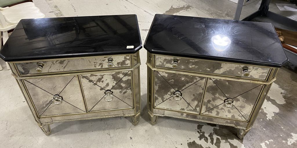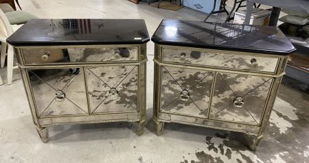 Pair of Zhong Shun Wood Art Mirrored Night Stands, single drawers, two door, one has crack on drawer, not silver mirror, that is floor refection, 29"h., 30"w., 17"d. Location: 2nd Row Pair of Zhong Shun Wood Art Mirrored Night Stands, single drawers, two door, one has crack on drawer, not silver mirror, that is floor refection, 29"h., 30"w., 17"d. Location: 2nd Row