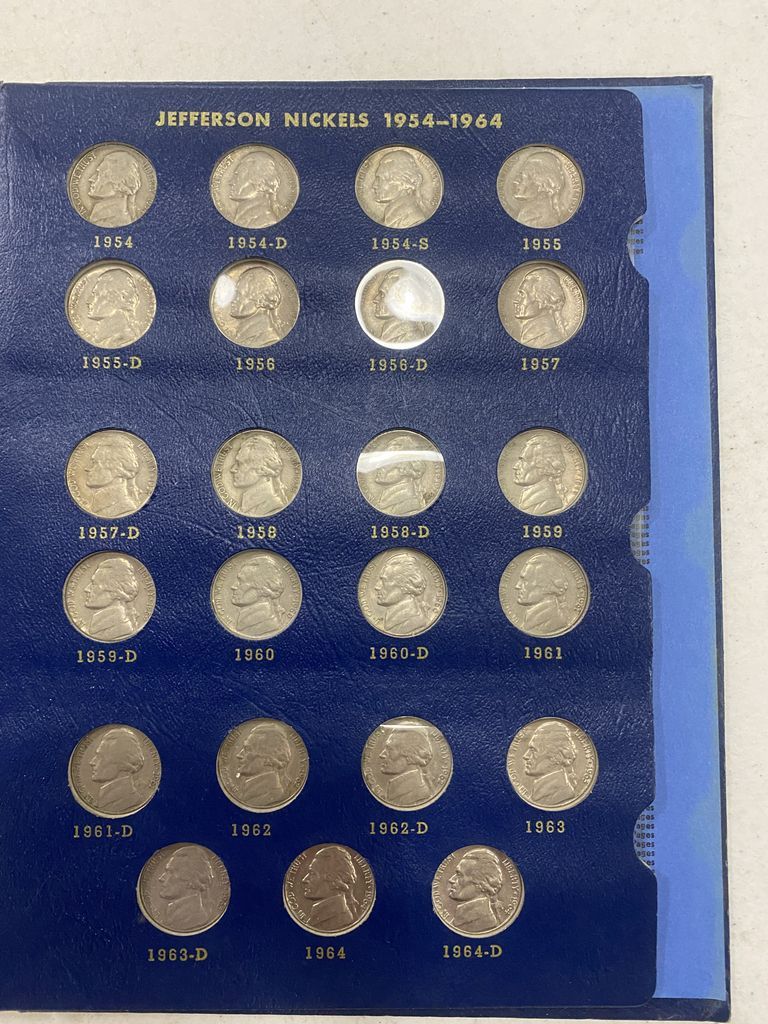 Jefferson Nickel Collection 1938-1964, Coins mounted in Whitman Classic Album, complete set including key date 1950 D mint and eleven 35% silver war nickels. Jefferson Nickel Collection 1938-1964, Coins mounted in Whitman Classic Album, complete set including key date 1950 D mint and eleven 35% silver war nickels.