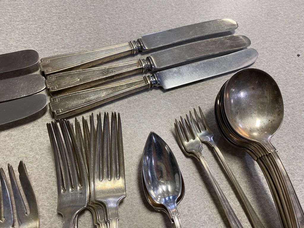 Sterling Flatware Set, monogrammed, marked pat 1913, lion, anchor, 10 soup spoons, 6 ice tea spoons, 6 dinner forks, 8 salad forks, 4 cream spoons, 4 cocktail, 13 spoons, 6 knives. 47 ozt. Sterling Flatware Set, monogrammed, marked pat 1913, lion, anchor, 10 soup spoons, 6 ice tea spoons, 6 dinner forks, 8 salad forks, 4 cream spoons, 4 cocktail, 13 spoons, 6 knives. 47 ozt.