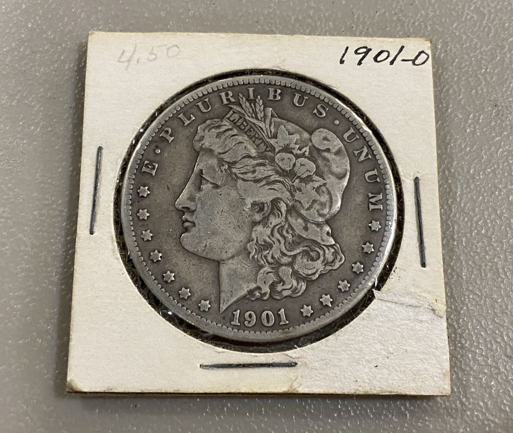 1901-0 Morgan Silver Dollar, good condition, in paper case. 1901-0 Morgan Silver Dollar, good condition, in paper case.