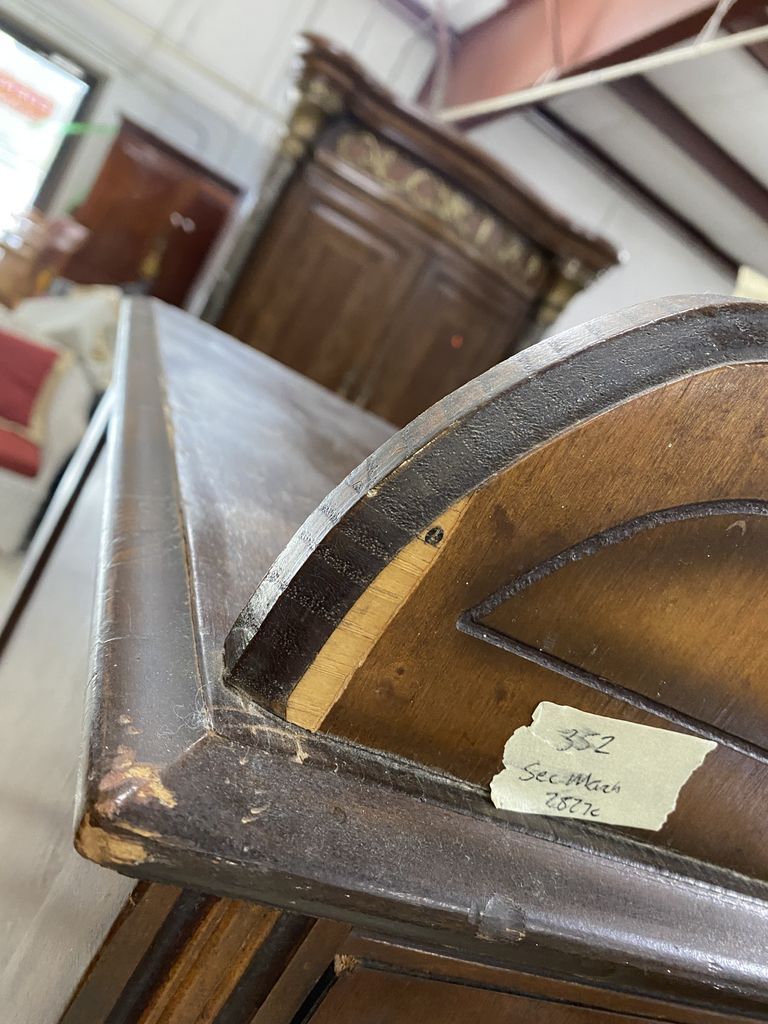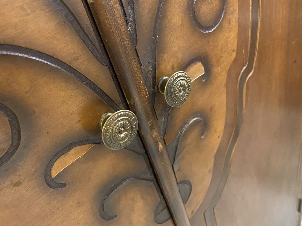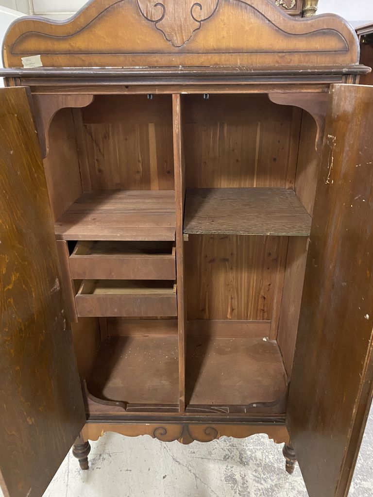 Depression Era Chifferoble, Walnut, two door with interior shelves, has some casters, two are damaged, has age wear, 66"h., 35"w., 20"d. Location: 3rd Row Depression Era Chifferoble, Walnut, two door with interior shelves, has some casters, two are damaged, has age wear, 66"h., 35"w., 20"d. Location: 3rd Row