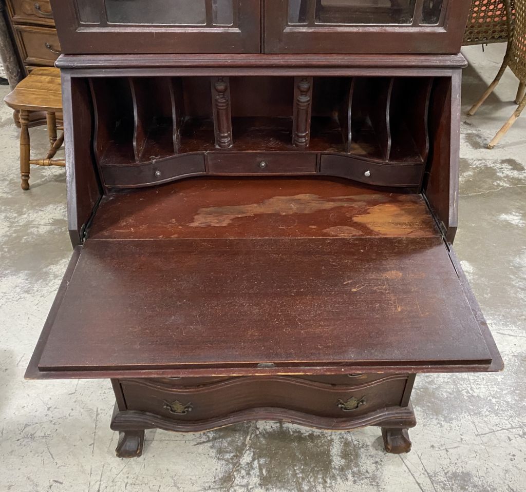 Mahogany Chippendale Style Secretary Bookcase, one piece, broken pediment style crest, ball-n-claw, drop front writing desk, has finish work, 79"h., 30"w., 15"d. Location: 3rd Row Mahogany Chippendale Style Secretary Bookcase, one piece, broken pediment style crest, ball-n-claw, drop front writing desk, has finish work, 79"h., 30"w., 15"d. Location: 3rd Row