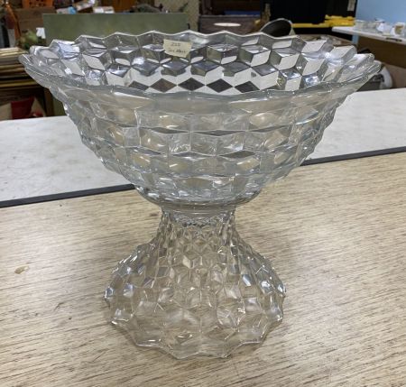 Fostoria American Pattern Punch Bowl, and stand, 12"h., 14"dia. Location Right Metal Shelves Fostoria American Pattern Punch Bowl, and stand, 12"h., 14"dia. Location Right Metal Shelves