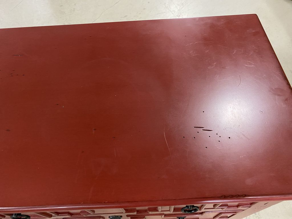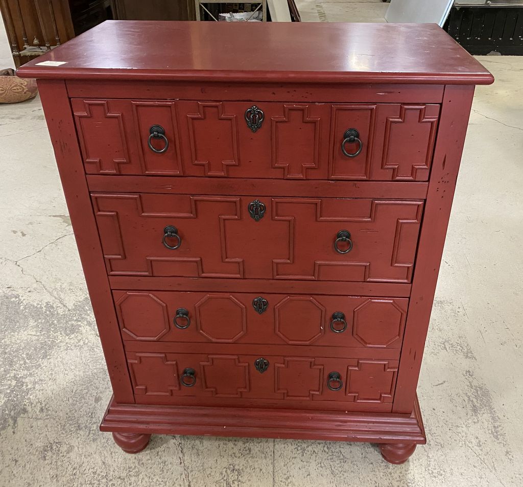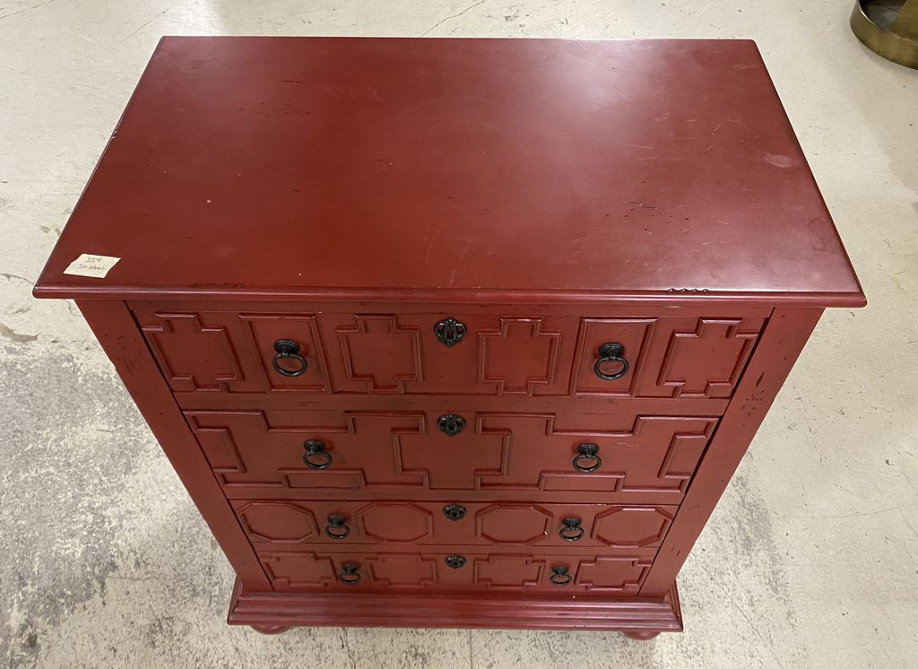 Modern Red Asian Style Chest of Drawers, made in china, four drawers, red, light scuffs on top, 36"h., 28"w., 18"d. Location: 2nd Row Modern Red Asian Style Chest of Drawers, made in china, four drawers, red, light scuffs on top, 36"h., 28"w., 18"d. Location: 2nd Row